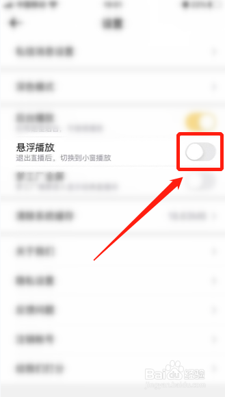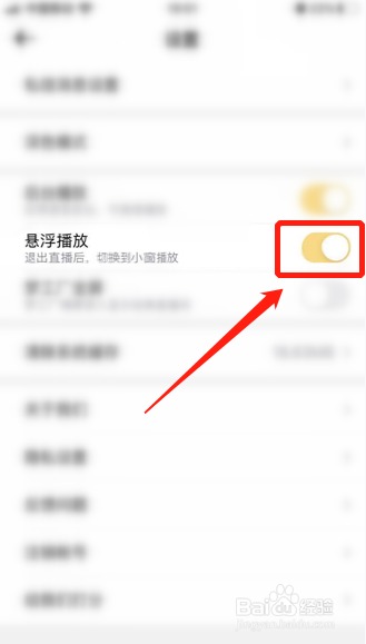 4、找到悬浮播放,点击厥后面的开关;
