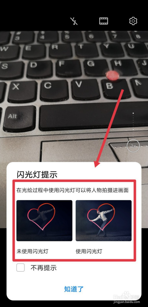 选择光绘涂鸦后,会弹出提醒,需要操纵闪光灯才能袭著拍出相关结果;