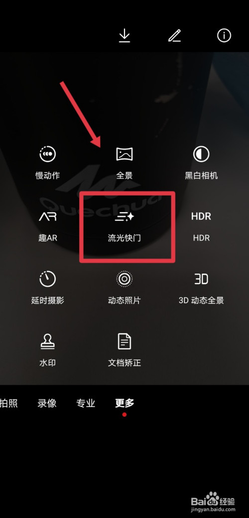 在更多功能选项中,选择流光快门;