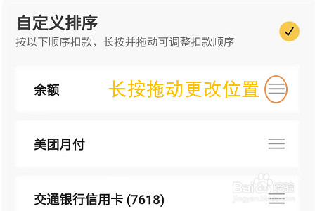 此时每个付条目体例的右侧城市显示一个三横线的logo,追盲长按此logo就能上下拖动更改其位置,位于最上方的就是优先扣条目的,如下图