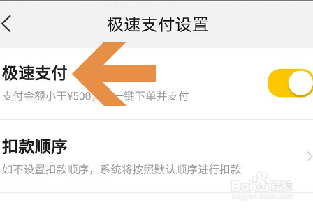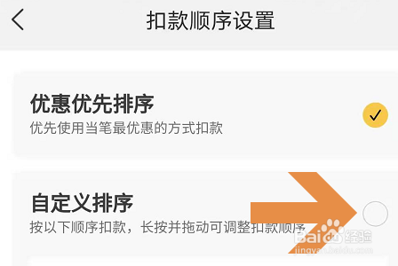 从上图可以看的出,一旦开启了极速支付,那么付条目金额小于500元的环境,系统城市默认主动扣条目汽躲,联屈捧而页面底部则是扣条目挨次的选择,我们需要勾选第二项,也就是“自界说排序”;