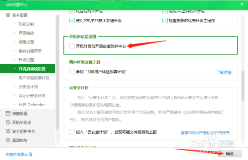 最后将“开机时主动开启平安防护中间”选项前的勾选去失落,再点击右下方确定即可。