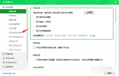 5、将“开机时主动开启平安防护中间”选项前的勾选去失落,再点击右下方确定即可。