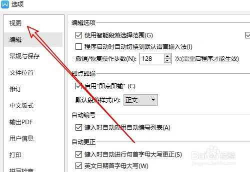 这时会打开WPS2019选项窗改返虚口,点击视图菜单。