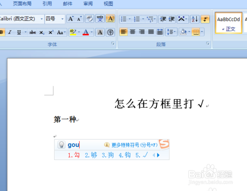 1、第一种方式,打开word,用输入法打出一个勾,然后选中√,再按一下菜单栏里面的有方框的A。
