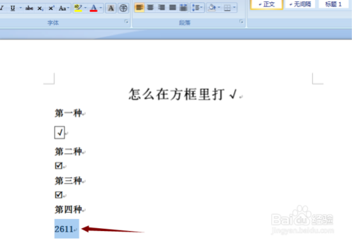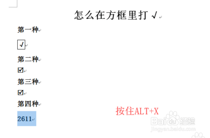 5、第四种方式,打出数字2611,选中,然后按住快捷键ALT+X,就会酿成带方框的√了。