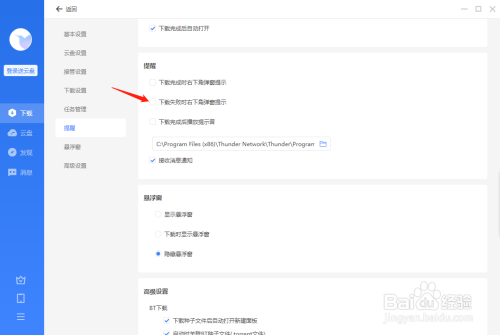 5、将“下载掉败时右下角弹窗提醒”前的勾选去失落即可。