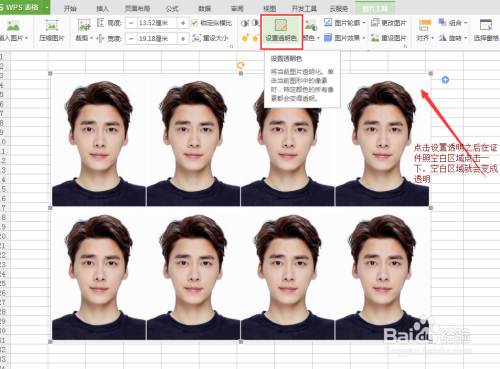 然后点击图片东西菜单下面的设置透明按钮,然后再证件照的布景色区域点击一下,此时布景色区域就会酿成透明。如下图