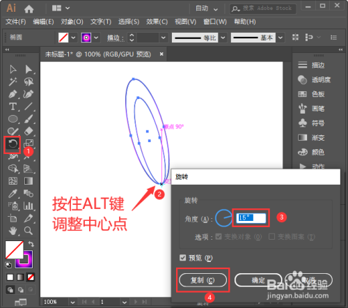 接着,我们把两个卵形状一路选中,点击【扭转东西】调整好中间点,角度为15°,点击【复制】,如图所示。