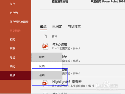 点击【更多】下面的【选项】进入【PowerPoint选项】;
