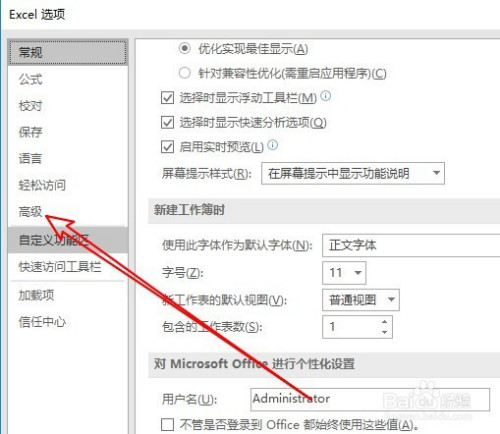 接着在打开的Excel选项窗口,点击左侧的高级菜单。