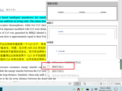 点击【页眉】之后,选择下拉菜单的【编纂页眉】;