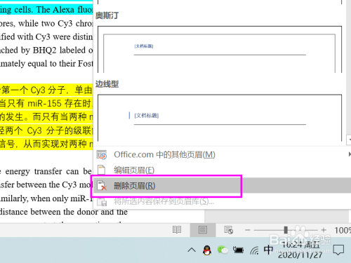 若是想要删除【页眉】,则直接点击【页眉】下拉菜单的【删除页眉】,这样删除操作就完当作了!