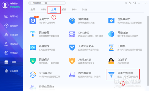 依次点击【上网】选项卡>>【网页告白过滤】。