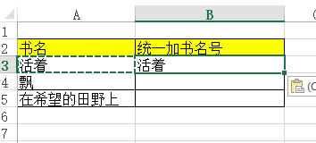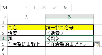 鼠标【左键】单击【B4单位格】,按住键盘上的【Ctrl+E】组合,即可完当作所有的书名加《》的操作。
