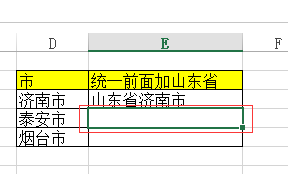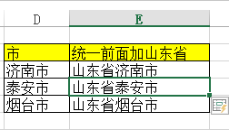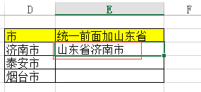 同样事理,若是想将【D列单位格】中的所有地级市前加所属省的名称,则首先复制第一个地级市(济南市)到【E3单位格】,再将【E3单位格】内容点窜为【山东省济南市】。