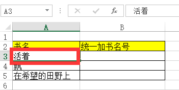 首先鼠标左键【单击】图中的【A3单位格】,按【Ctrl+C】复制第一本书的书名【在世】,再单击【B3单位格】,按【Ctrl+V】粘贴。