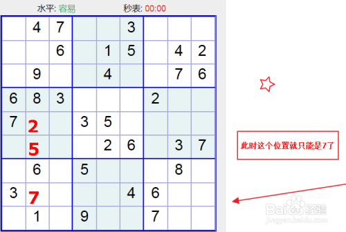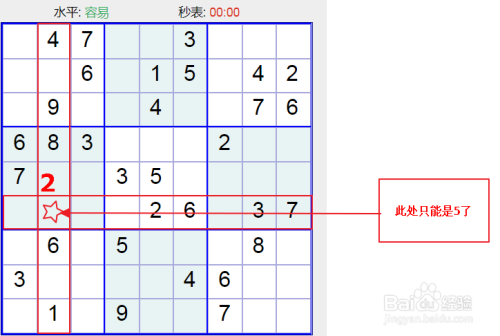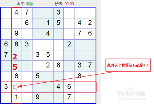 下面这个就比力简单了,如下图所示有一个竖行已经就剩一个数没有填写了,这个位置很明的就只能是3了;