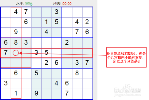 我们首先从最简单的数独说起,不雅察如下图所示我们找到一个在横行和竖行数字做多那个,此处只能填写2或者6,可是一个九宫格内不克不及有反复,所以这个只能是2;