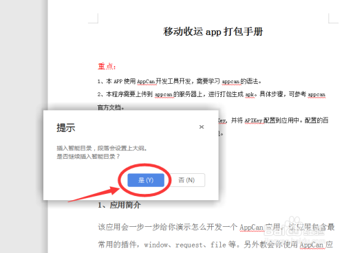 在提醒(wps office)“插入智能目次”处,点击“是”。