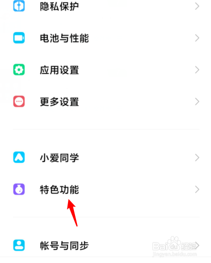 在设置中,点击特色功能的选项。
