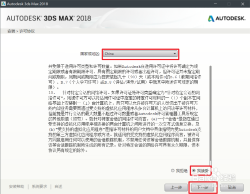 这里的是 Autodesk公司的 软件许可及办事和谈,看完后选择“我接管”,然后单击“下一步”