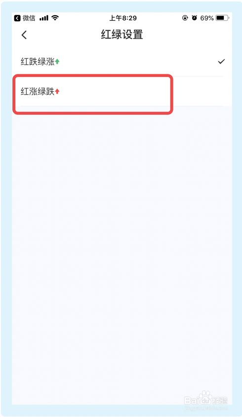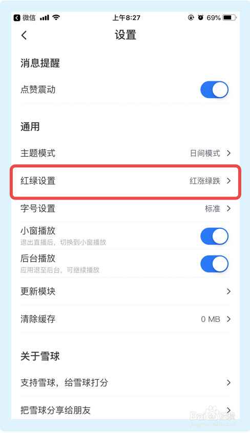 5.在【红绿设置】选项,点击【红涨绿跌】选项,完当作以上步调雪球app即可更改红绿设置。