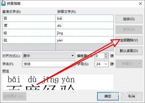 然后在打开的拼音指南窗口,点击右侧的全数删除按钮。