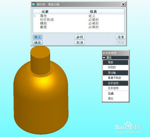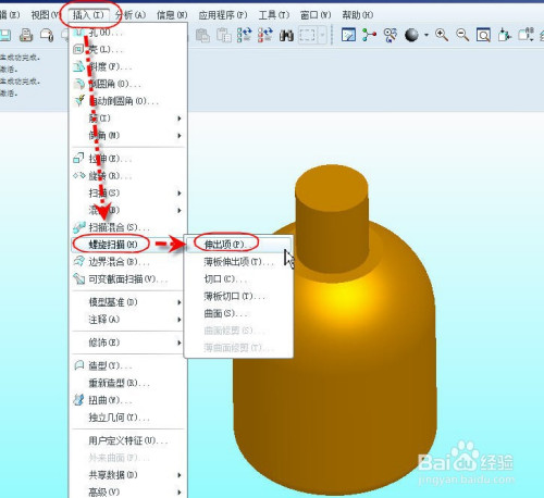 选择【插入】菜单下的【螺旋扫描】,选择【伸出项】