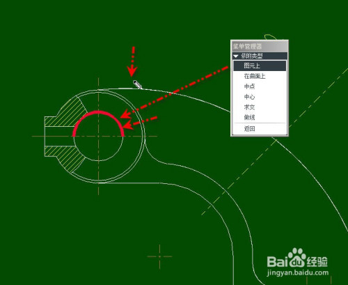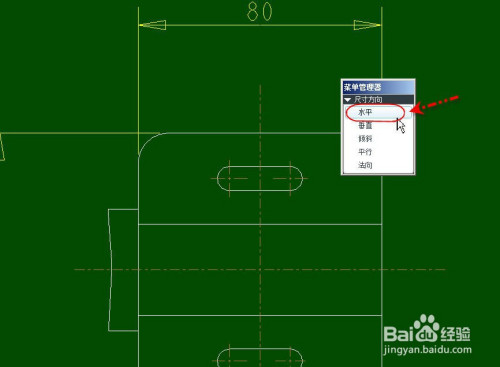 在【菜单办理器】中的【凭借类型】菜单中选择【图元上】,按住CTRL键别离选择图示的两条边,然后在中心图示位置按中键放下尺寸