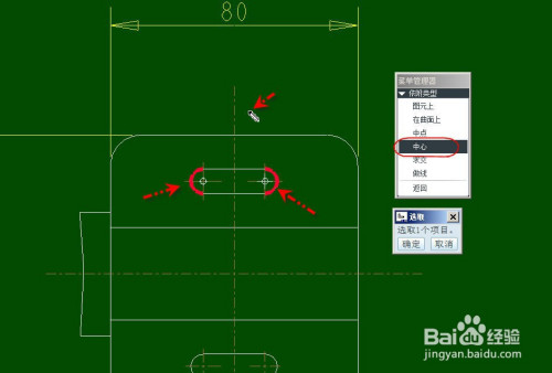 再次点击【尺寸】按钮,此次【凭借类型】选择【中间】,然后按住CTRL键别离选择图示摆布半圆弧,然后按中键在图示铅笔处点击,在弹出的【尺寸偏向】菜单中选择【程度】,获得两圆弧中间的程度距离尺寸
