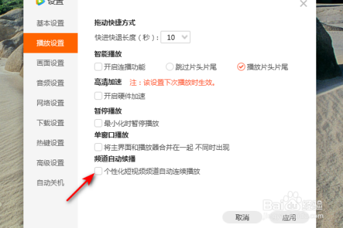 之后点击应用,然后点击封闭,这样便开启了个性化短视几次道主动持续播放。