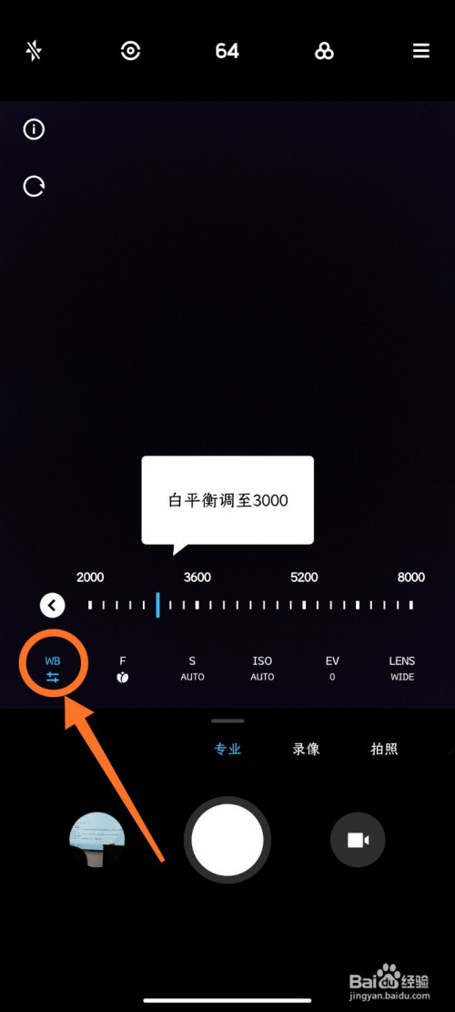然后点击“WB”,将WB白均衡调到3000(顺应当前情况的大小)