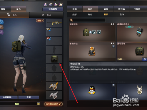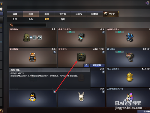 然后点击“脚色”选项,找到“炫彩背包”道具;