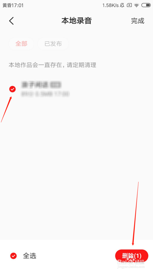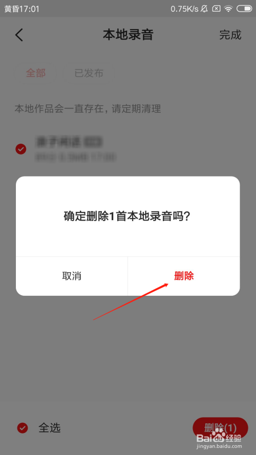 选摘要删除的当地灌音选项,然后点击右下角的删除按钮。