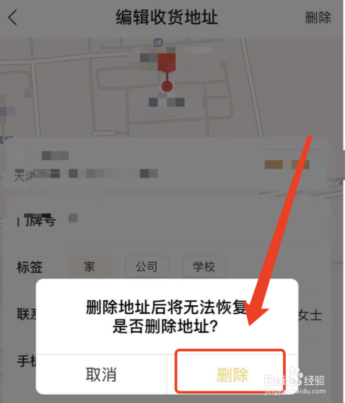 点击后界面弹出【删除地址后将无法恢复 是否删除地址】提醒,继续点击【删除】即可,如图