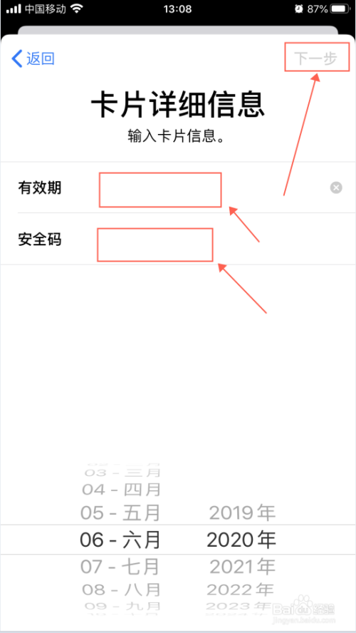 5.选择有用期,输入信用卡后面的平安码,在条条目与前提界面,点击选择右下角的赞成