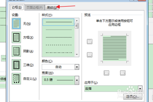 在弹出“边框和底纹选项”对话框中,切换到“底纹”选项卡。