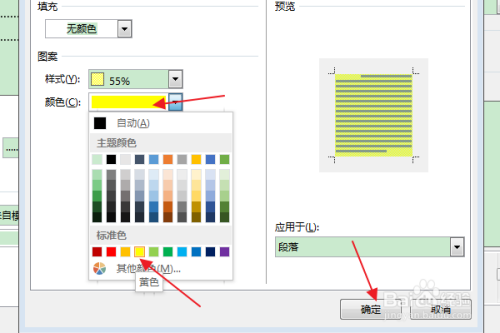 在图案栏中的“颜色”下拉列表中,选择“黄色”,点击确定。