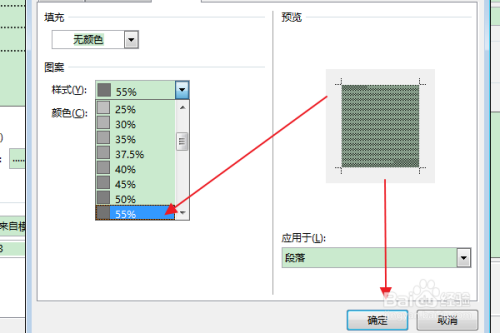 在图案栏中的“样式”下拉列表中,点击“55%”,点击确定。