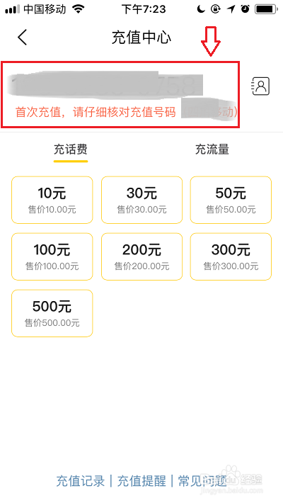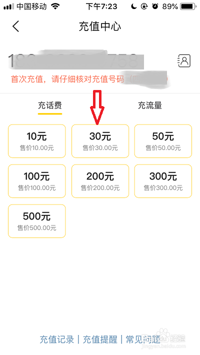 充话费的手机号设置好后,点击下方的充值金额。(以下截图是我以充值30元话费为例)
