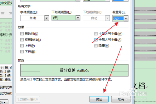 在弹出“字体”对话框中,在“着重号”下拉框中选择“无”选项,点击确定。