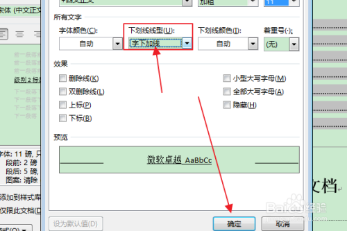 在弹出“字体”对话框中,在“下划线线型”下拉框中选择“字下加线”,点击确定。
