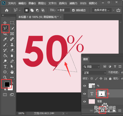 我们给数字的图层添加上蒙版,然后用【多边形套索东西】框出一个三角形填充上黑色即可,如图所示。
