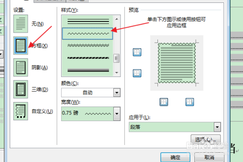 在弹出“边框和底纹”对话框中,在“设置”中选择“方框”后,在“样式”列表下拉并选择“海浪线”样式,点击确定。
