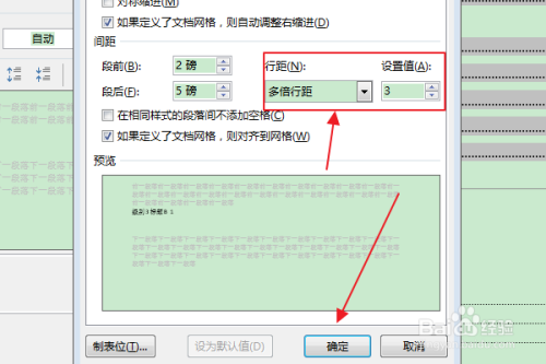 在弹出“段落”对话框中,在“行距”下拉框中选择“多倍行距”选项,在右侧的“设置值”中输入行数(好比:3),点击确定。