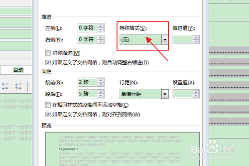 在弹出“段落”对话框中,在“特别格局”下拉框中选择“(无)”选项,点击确定。