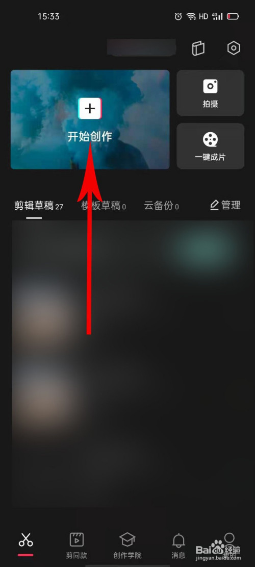 第一步,打开手机剪映软件,点击起头创作,如图。