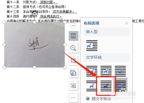 插入手写签名的图片后,点击图片结构选项,设置为衬于文字下方。