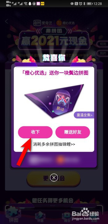 页面弹出恭喜您,并弹出一张拼图,点击收下。